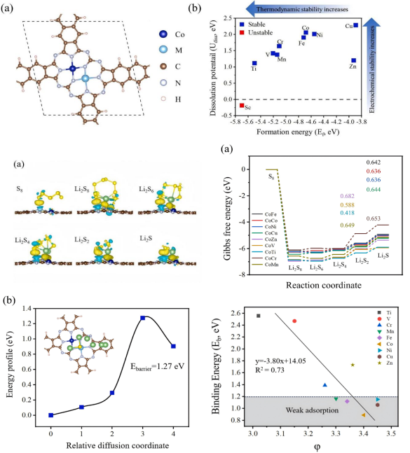 在本研究中,提出了一系列二维双原子催化剂(BACs),即基于钴基双金属扩展酞菁单层(CoM-EPc,M=Sc、Ti、V、Cr、Mn、Fe、Co、Ni、Cu、Zn)作为LiSBs的载体材料。第一性原理计算表明,在所有二维BACs中,CoTi-EPc、CoV-EPc、CoCr-EPc和CoZn-EPc对可溶性LiPSs的结合强度适中,有效抑制了“穿梭效应”。此外,我们提出了基于Allred-Rochow电负性的描述符φ,发现了结合能与Allred-Rochow电负性之间存在近似的线性关系,为合理催化剂设计提供了理论基础。本工作系统地确定了高性能BAC候选物,并提出了提升LiSBs性能的新策略。