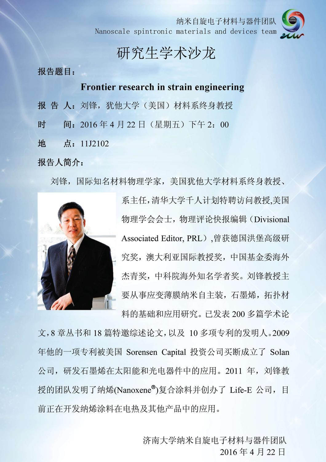 应我团队邀请,美国犹他大学刘峰教授于4月22日,在济南大学11教成功举办了题目为《Frontier research in strain engineering》的学术报告。